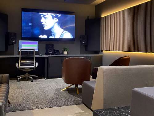 The floor plan is built around Studio A, our premier Dolby Atmos® control room that includes an adjoining isolation room. It is flanked by Studio B, which doubles as a secondary isolation room and podcast space. Studio C is a multipurpose edit room just down the hall, and Studio D is our soundstage, interconnected with audio/video tie lines to the other rooms.